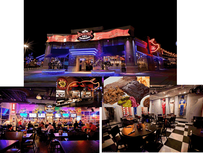 Backfire Barbeque™ is a one-of-a-kind attraction that features dining, entertainment and retail in an interactive, multi-sensory environment complete with the sound of revving engines, giant revolving motorcycle fountains, classic cars, the hottest custom choppers, the rhythms of live entertainment and the mouth watering aroma of comfort foods and barbeque.
